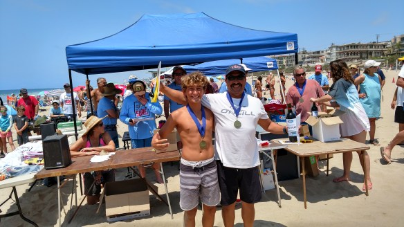 If DST’s performance was the stuff of winning in style, my own day was a scrappy dog-fight with 18 other “senior” men that still could really bring it in the water. Some were swimmers, others just brilliant bodysurfers. My first heat resulted in a 2nd place, propelled more by the shear number of waves I caught than by any stand-out tricks, but it was good enough to push me into the finals. In the finals, I kept to my plan: get all 10 waves that can be scored (they take the top four) and pull out a storage locker of the goofiest tricks I would never do on a big day. I came out of the water thinking “maybe a 3rd,” as I’d seen several guys pick off some long rides and bigger waves. But the judges thought differently. By a slight margin, I pulled it off: 1st place and two Thurmonds on top of the box at the end of the day. I couldn’t wear a wider smile. We won a bunch water gear and wine, but, more importantly, we had fun, made a few new friends, and created a memory that I’ll never forget.